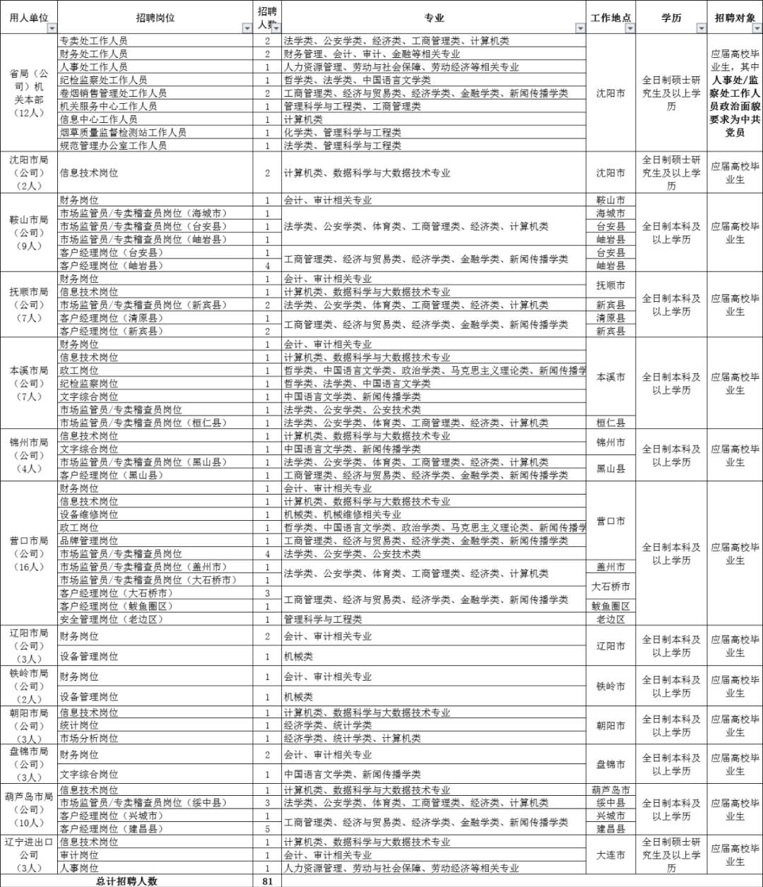 2020年中国烟草总公司辽宁省公司公开招聘计划与岗位表