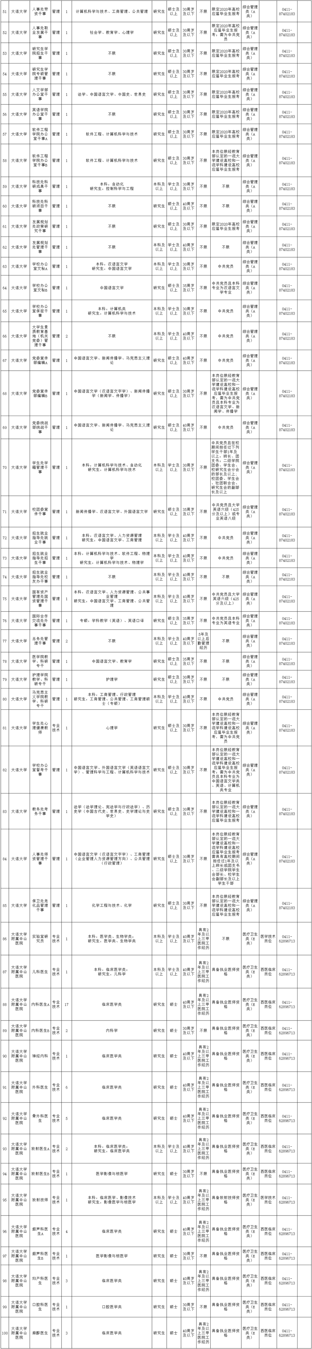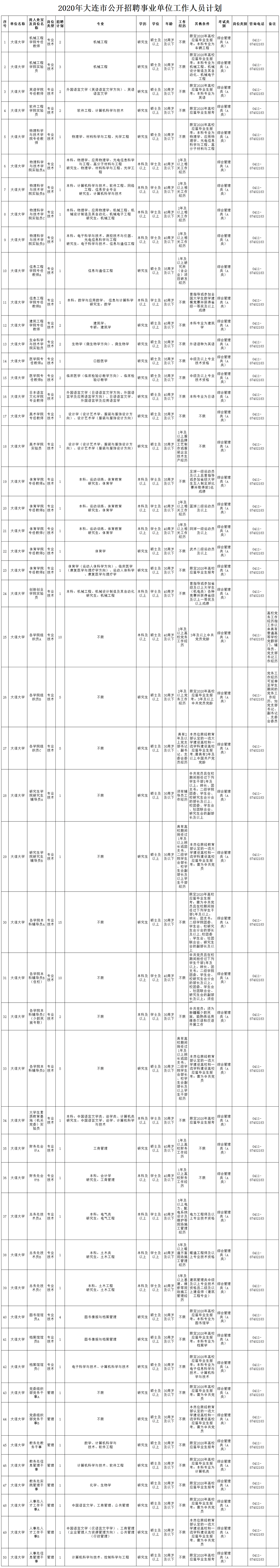 6月23日,大连市人力资源和社会保障局发布《2020年大连市公开招聘事业单位工作人员公告》,大连大学招聘事业编制工作人员具体岗位信息如下: